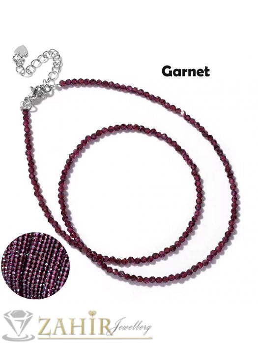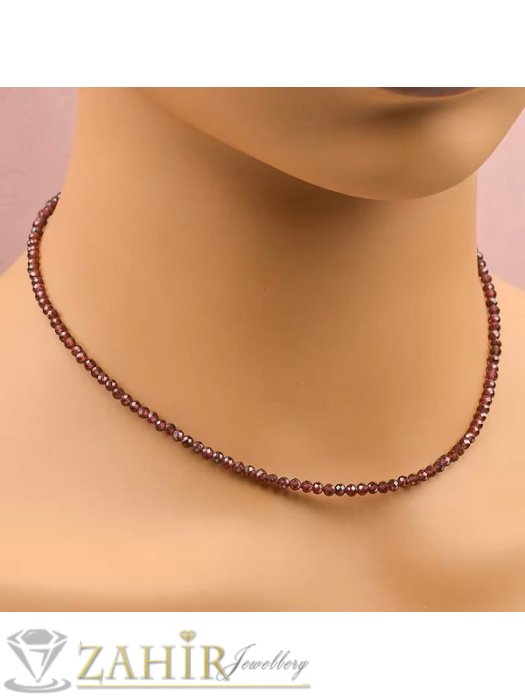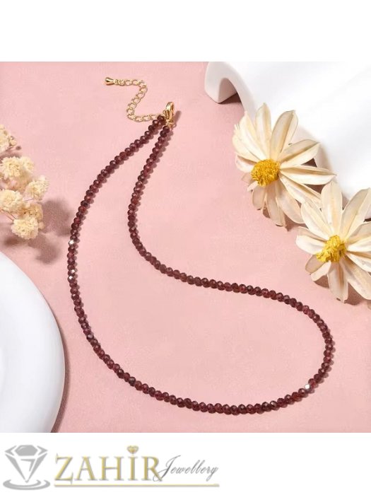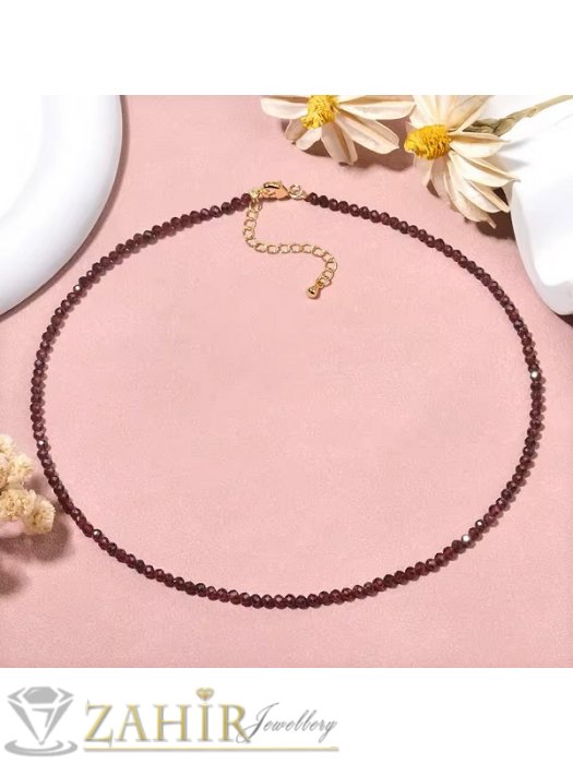 ДАМСКИ БИЖУТА - Модно ръчно изработено колие от малки 3 мм естествени камъни фасетиран гранат бургунди, стоманени накрайници - KA1056