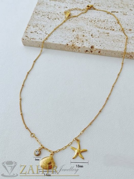 Дамски бижута - Морска звеза, мида и кристал от позлатена стомана на елегантна верижка 45 + 5 см удължител, златно покритие - K2265