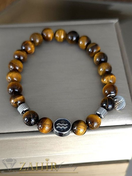 ДАМСКИ БИЖУТА - Избери от 12 модела ръчно изработени гривни със стоманени зодиакални знаци и кафяво тигрово око 8 мм, в 7 размера - ZG1284