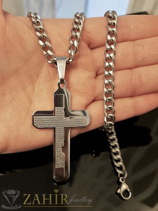 Бижута за мъже -Изящна висулка стоманен кръст 6+1 см с библейски надписи на класически стоманен ланец 55 - ML1157