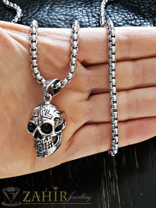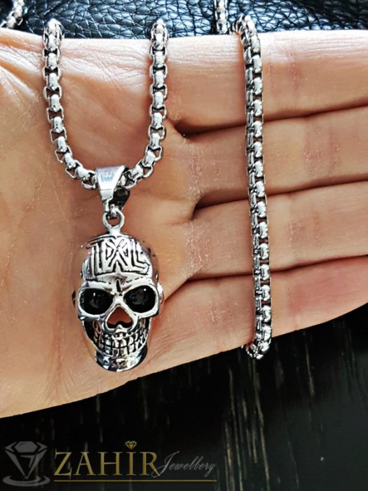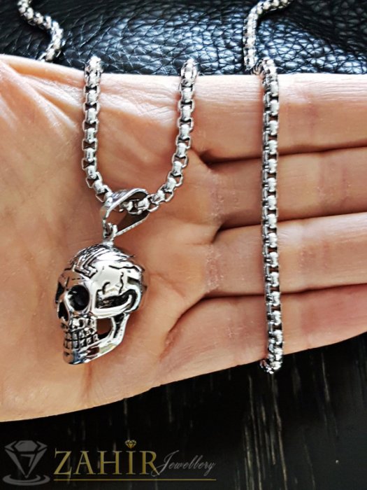 Бижута за мъже - Непроменящ цвета си висококачествен 3 D череп 3 см на 60 см стоманен ланец, широк 0,4 см - ML1292