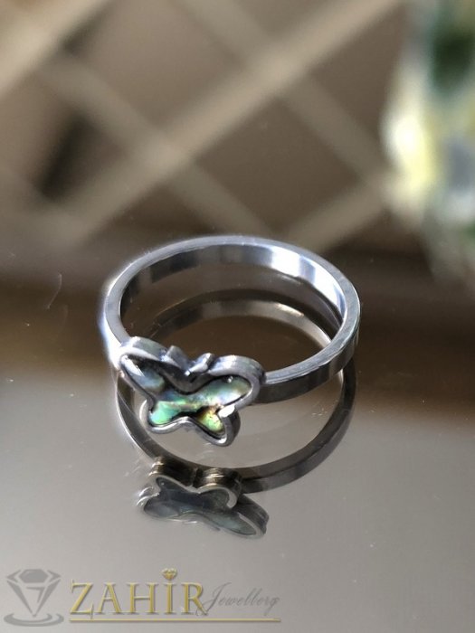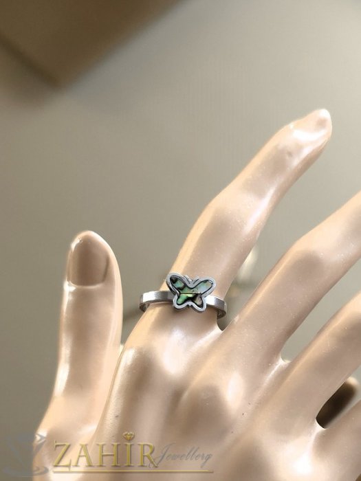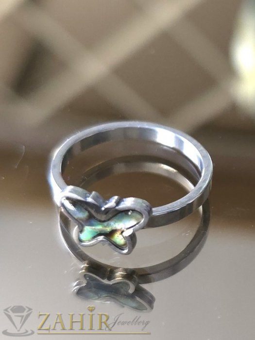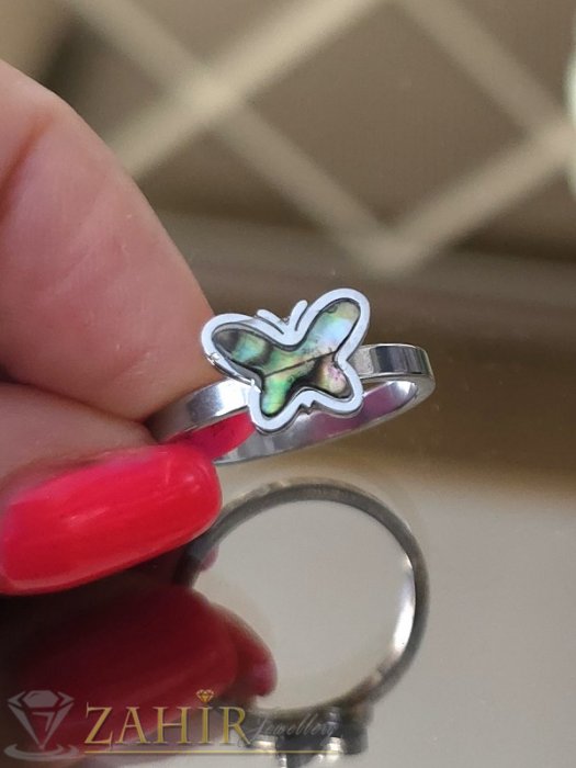 Дамски бижута - Нежен стоманен пръстен с пеперуда 1 см от преливащ мексикански седеф, не променя цвета си - P1609