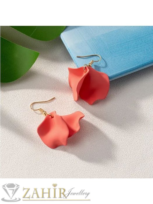 ДАМСКИ БИЖУТА - Нежни акрилни листенца в цят корал на стоманени обеци с кукички, размер на обеците 4,3 на 3,4 см - C1232
