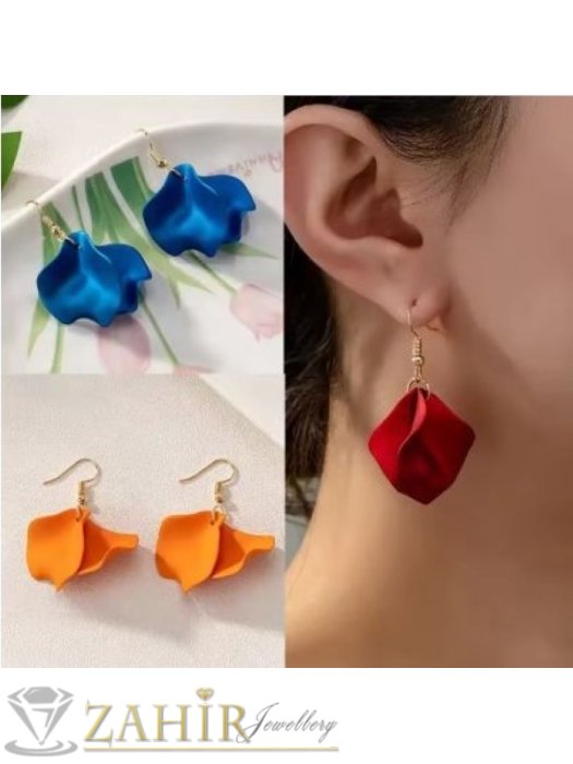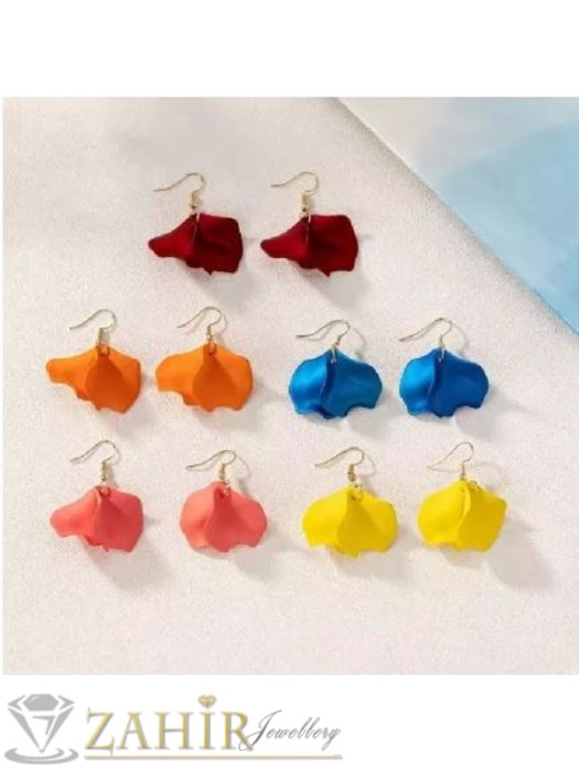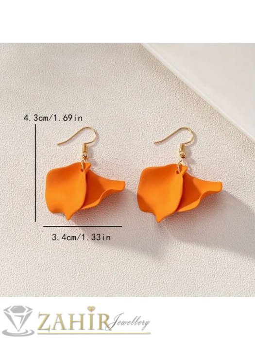 ДАМСКИ БИЖУТА - Нежни акрилни листенца в цят корал на стоманени обеци с кукички, размер на обеците 4,3 на 3,4 см - C1242