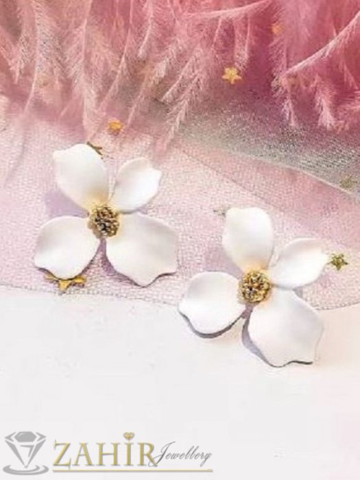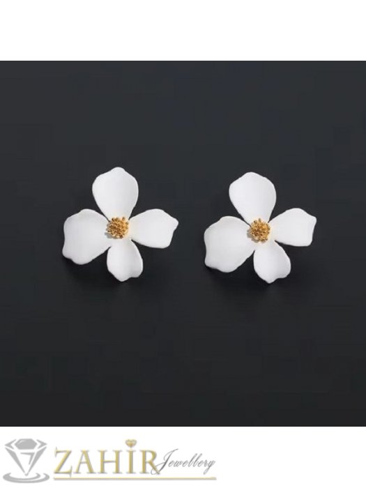 ЦВЕТНИ ОБЕЦИ - Нежни олекотени обеци цветя в матов снежнобял цвят с позлатени тичинки, размер 2,5 на 2,5 см, закопчаване на винт- C1155