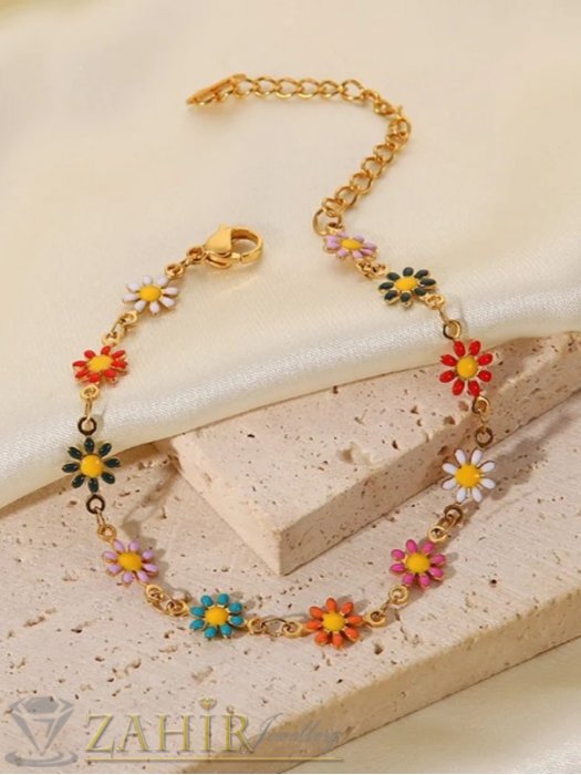 Дамски бижута - Нов дизайн разноцветни маргаритки на позлатена стоманена гривна за крак или ръка топ верижка, регулируеми с удължител - GK1416