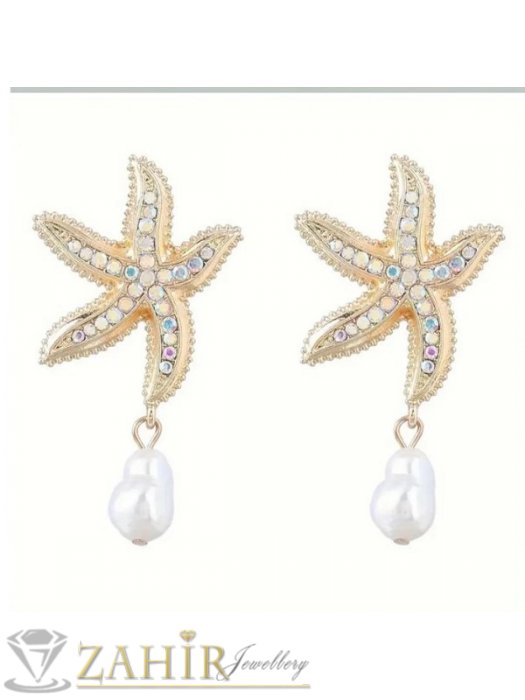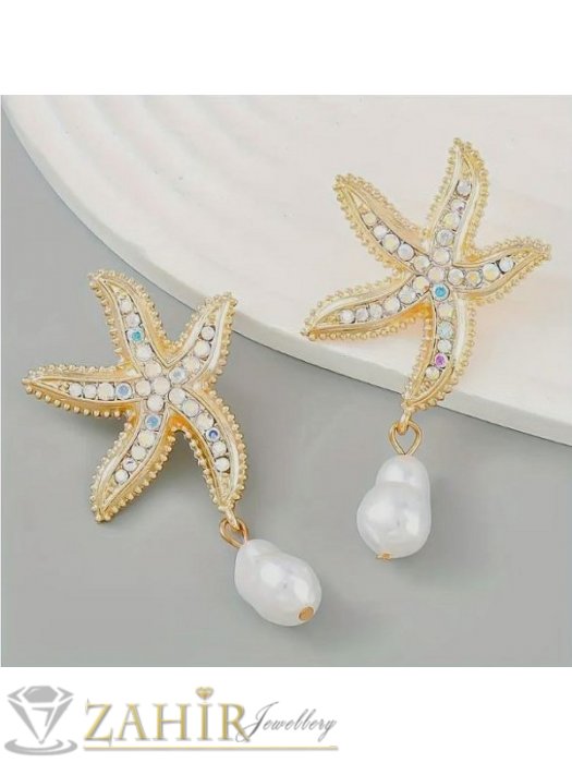 ДАМСКИ БИЖУТА - Обеци морски звезди с бели хамелеон кристали и висящи перли на златиста основа, размери 5,6 на 3,4 см, закопчаване на щифт - C1224