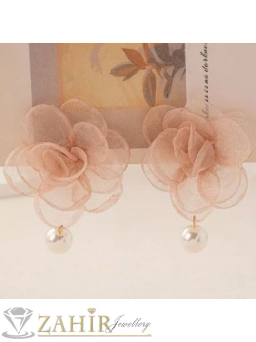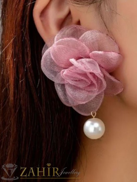 АРТ БИЖУТА С МЪНИСТА - Обеци с розов цветен акцент от органза и вицяща перла, размери 5,5 на 6 см,на винт - N1526