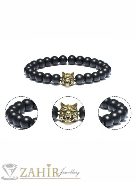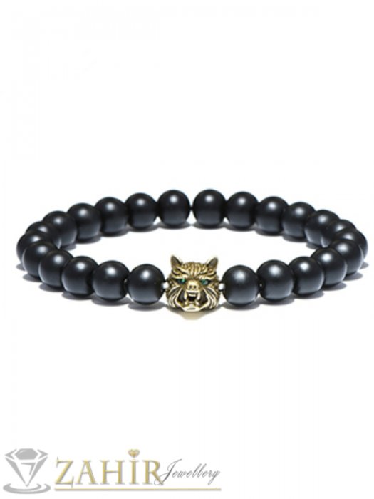 Дамски бижута - Позлатена глава на Вълк 1,3 см на черна гривна от оникс 8 мм, налична в 7 размера - MGA1326