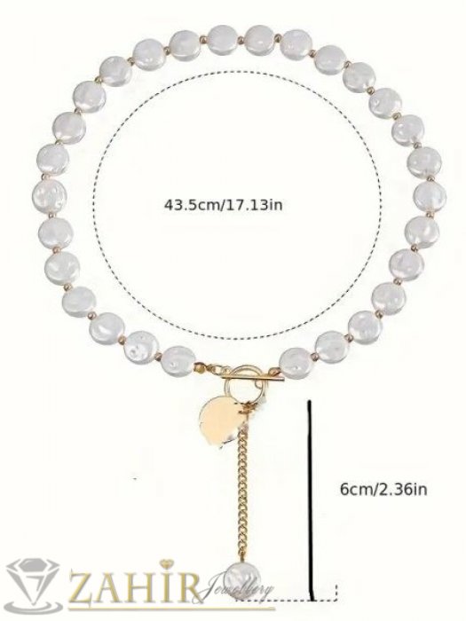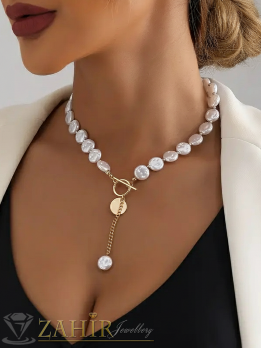 Моделът е завършен с висококачествена стоманена закопчалка, която не потъмнява, не предизвиква алергии и поддържа огърлицата стабилно и удобно по време на носене. Към нея е добавена ефектна висулка монета и перла, която подчертава изисканата форма на огърлицата и добавя модерен, стилен акцент.