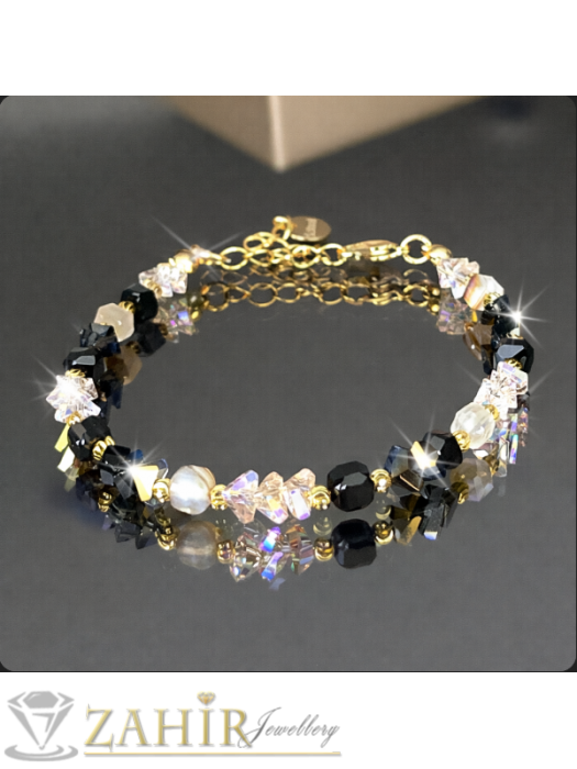 Модерна магия в детайла! Тази уникална ръчно изработена гривна съчетава мистиката на черния турмалин с луксозния блясък на триъгълните кристали, създавайки аксесоар, който е истинско произведение на изкуството.