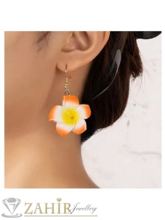 ДАМСКИ БИЖУТА - Преливащи жълто-оранжеви хавайски цветя на висящи обеци със стоманени кукички, размер на обеците 5,8 на 3,7 см - C1234