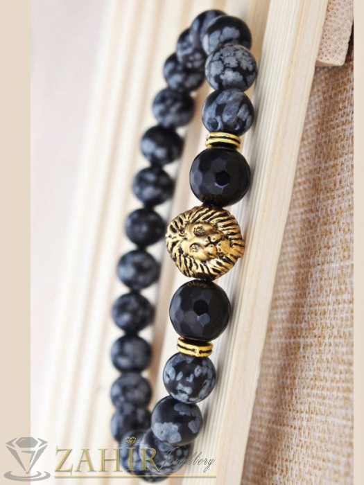 Бижута за мъже - Ръчно изработена ластична гривна от 8 мм естествен обсидиан и метално лъвче - MA1034