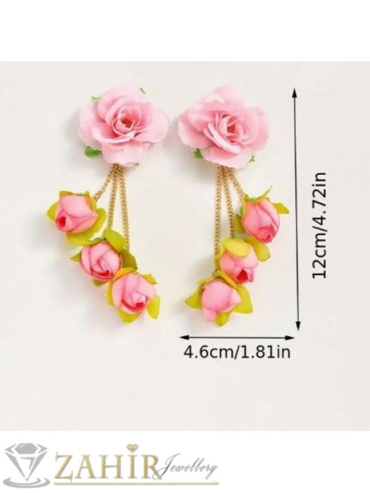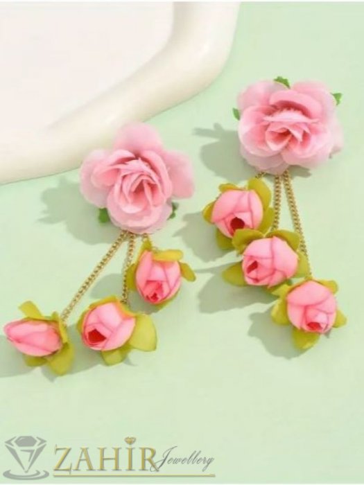 Ръчно изработени дамски обици с розови рози и висящи пъпки – романтичен флорален стил