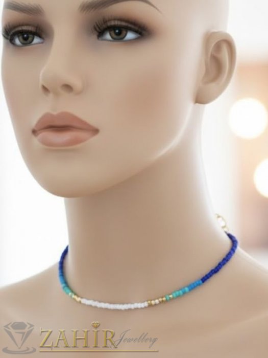 Добавете стилен акцент към визията си с това изискано колие от мъниста, изработено в свежа цветова комбинация от тъмносиньо, тюркоазено, бяло и златисто. Дизайнът е минималистичен, но в същото време ефектен – подходящ както за ежедневието, така и за специални поводи.