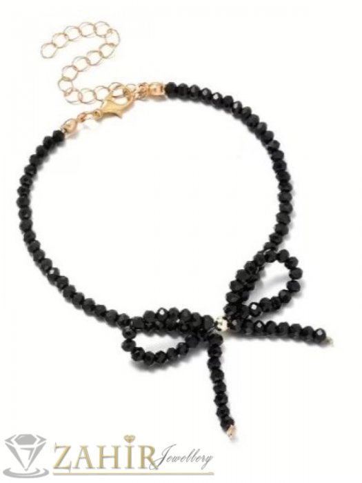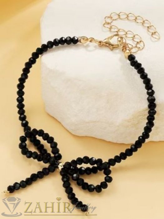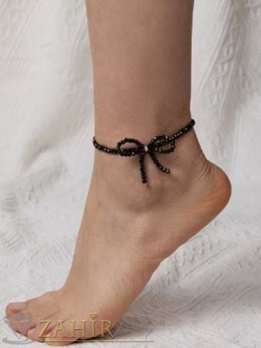 АРТ БИЖУТА С МЪНИСТА - Стилно ръчно изработена гривна за крак от черни фасетирани мъниста синци 3 мм с нежна панделка, 4,5 см, дълга 21 см удължител 6 см - N1717