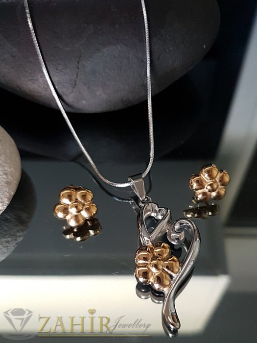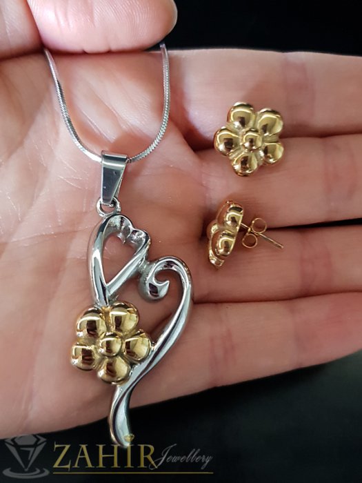 Стоманен комплект с висулка сърце 5 см на колие 52 см и обеци 1,5 см