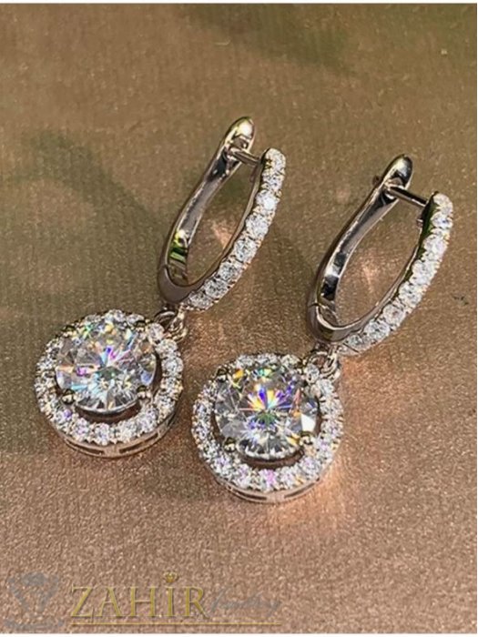Дамски бижута - Уникални блестящи халки с висулка кръгъл фасетиран циркон с малки кристали,сребърно покритие, английско закопчаване, размери 2,7 на 1 см - O3059