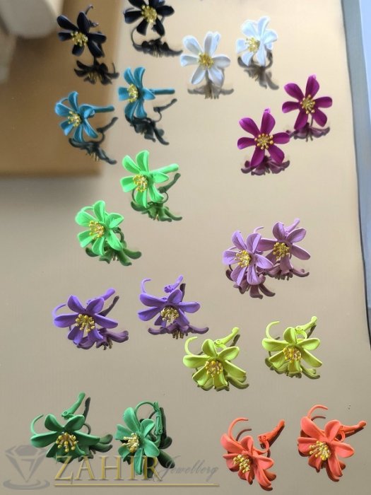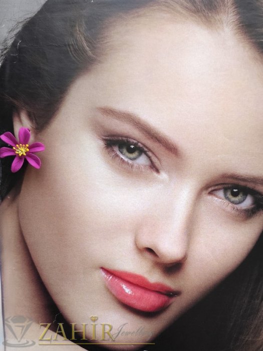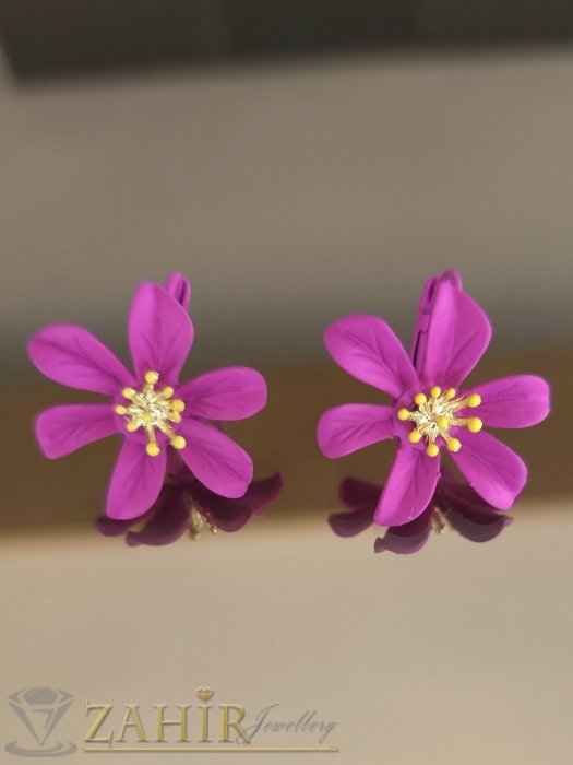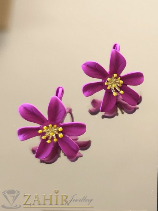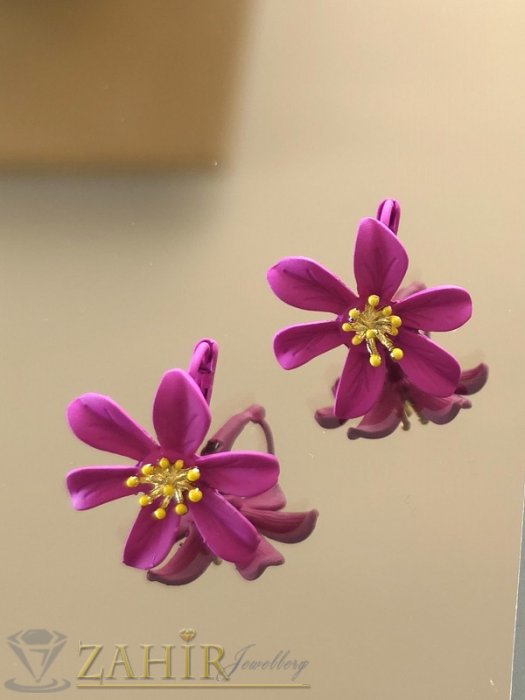 ЦВЕТНИ ОБЕЦИ - Уникални олекотени метални обеци цветя в цвят циклама (фуксия) мат с позлатени тичинки, размер 2,5 на 2,8 см, френско закопчаване- C1051
