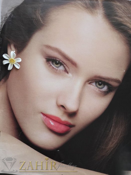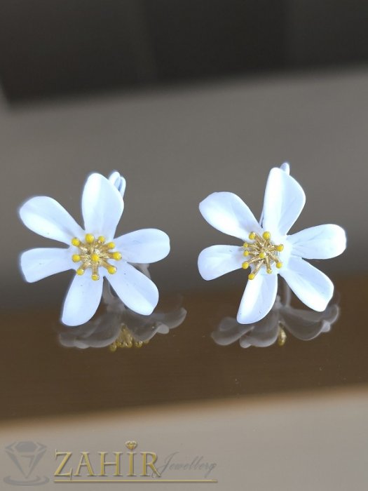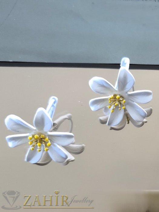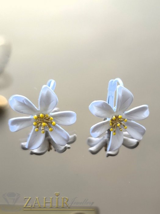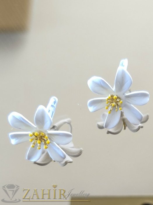 ЦВЕТНИ ОБЕЦИ - Уникални олекотени метални обеци цветя в цвят снежно бяло мат с позлатени тичинки, размер 2,5 на 2,8 см, френско закопчаване- C1081