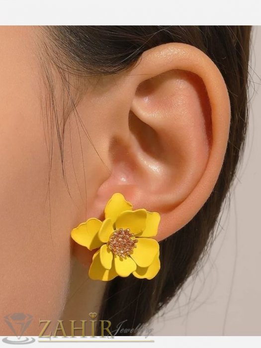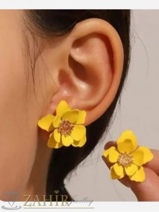 ЦВЕТНИ ОБЕЦИ - Уникални олекотени обеци цветя в матов жълт цвят с позлатени тичинки, размер 2,5 на 2,6 см, закопчаване на винт- C1119