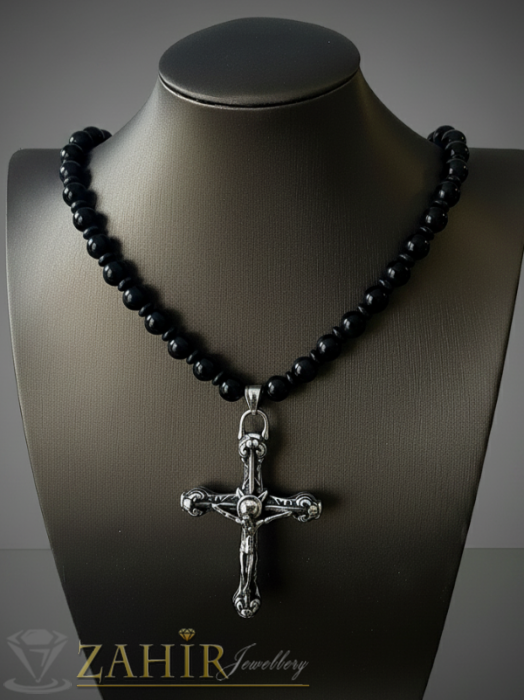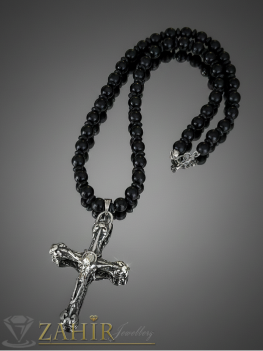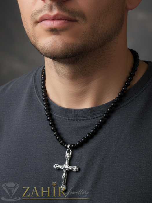 Мъжки бижута - Великолепен триизмерен стоманен кръст с Исус 7 на 5 см на колие в 2 размера черен оникс 8 мм и дървесни рингове - MK1540