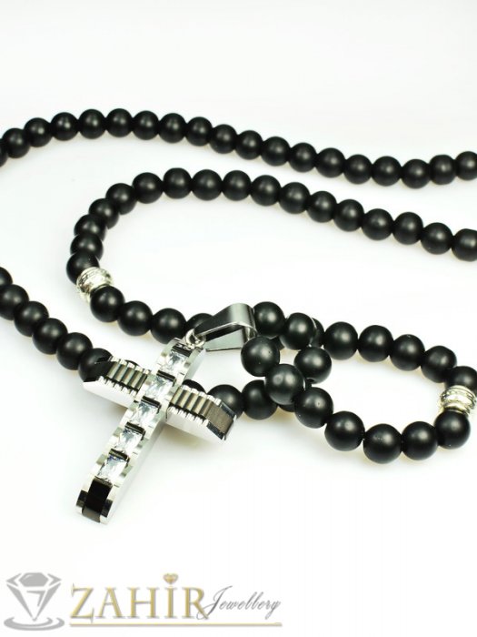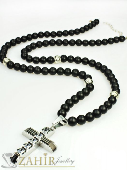 Великолепно колие от естествен оникс мат - 65+5 см с висулка уникален кръст от неръждаема стомана - 4,5 см