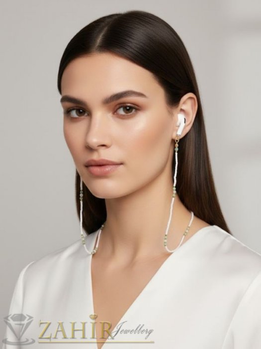 АРТ БИЖУТА С МЪНИСТА - Верижка за очила, сияйни бели мъниста, подчертана от контрастни перли, светлозелени мъниста и със златни разделители, дълга 77 см - N1696
