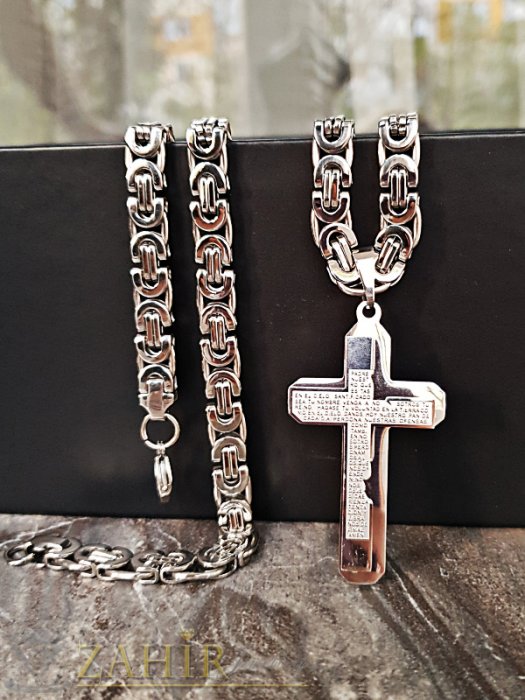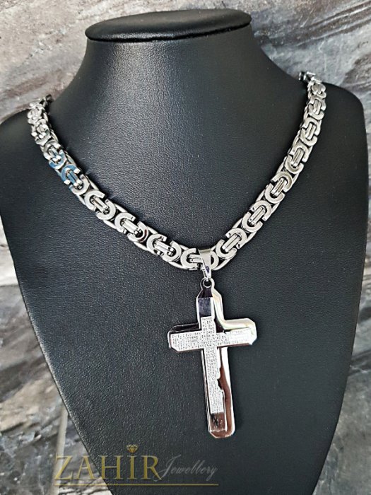 Бижута за мъже - Висококачествен стоманен ланец 61 см, широк 0,7 см, римска плетка с висулка стоманен кръст 6 см - ML1324