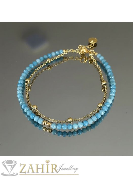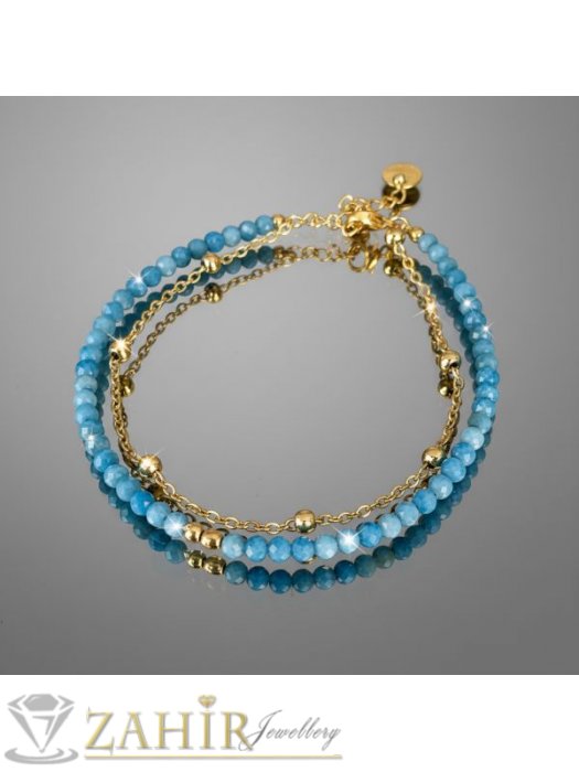 ДАМСКИ БИЖУТА - Впечатляваща гривна за ръка или глезен от естествен син апатит 3 мм и стоманена верижка с топчета, стоманени накрайници - GA3214