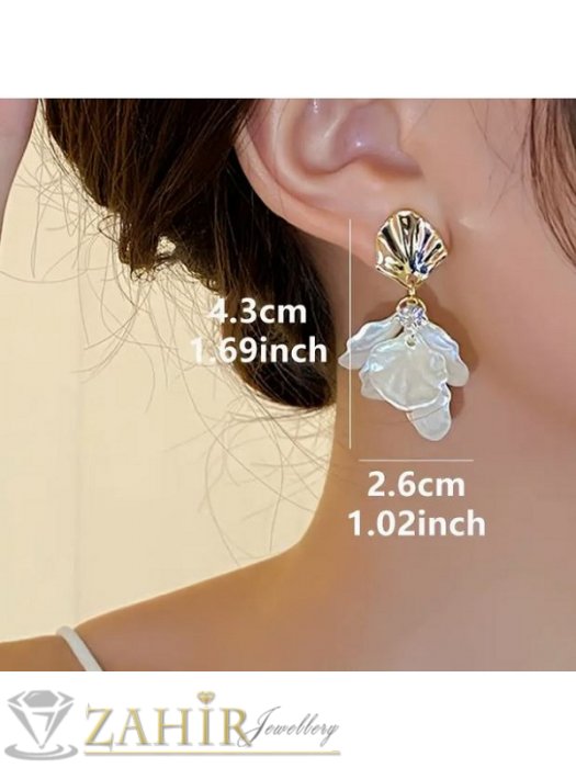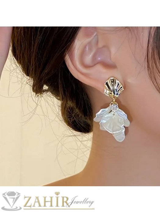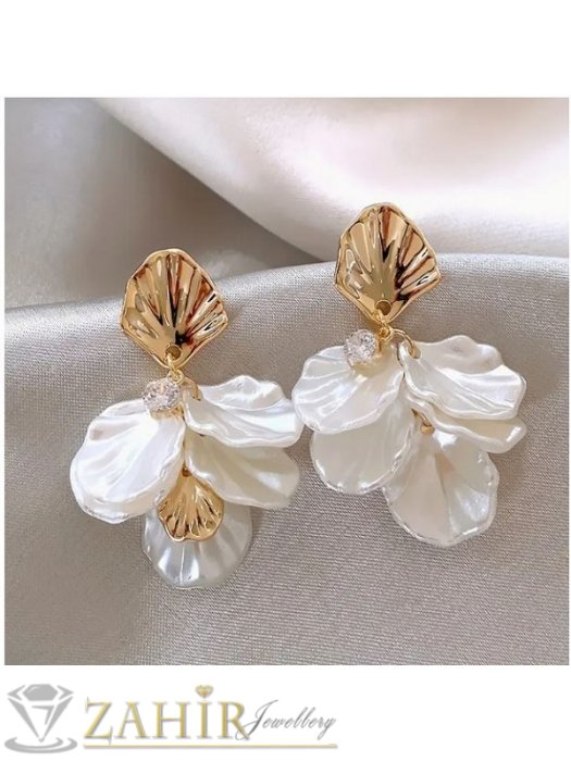 ДАМСКИ БИЖУТА - Златисти висящи обеци с висулки изящни перлени листенца и кристали, цинкова основа, размери 4,5 на 3 см, закопчаване на щифт - C1225
